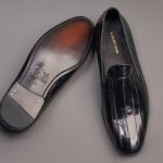Sleek black patent loafers with striking geometric etch artwork. Crafted for the modern gentleman. Available in all sizes.
